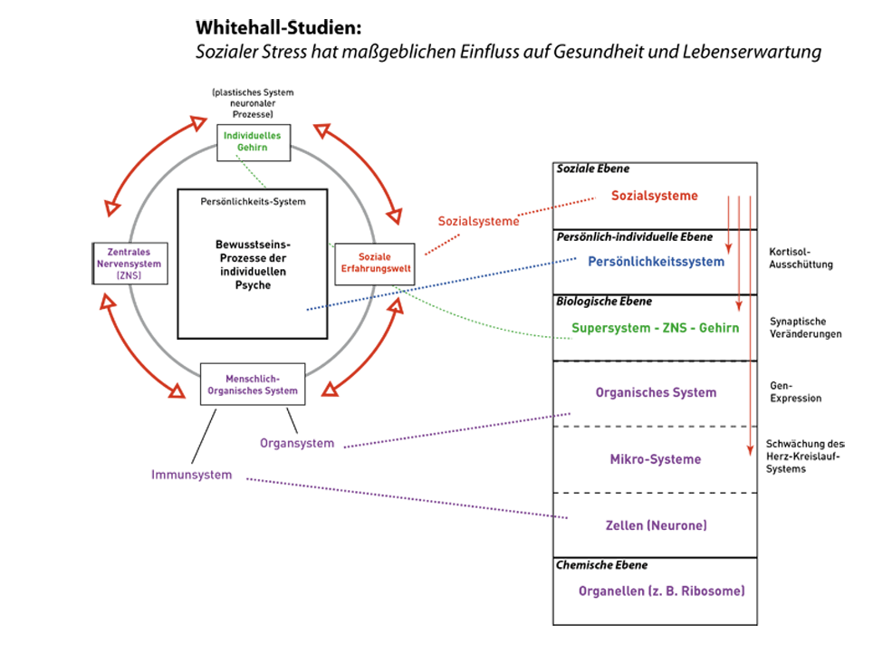 Bunge weist unter anderem auf die in Großbritannien durchgeführten, sogenannten Whitehall-Studien hin. Diese Untersuchungen haben gezeigt, dass sozialer Stress am Arbeitsplatz maßgeblichen Einfluss auf Gesundheit und Lebenserwartung haben: