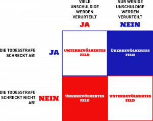 Ich benutze Beispiele aus einer Vielzahl von Bereichen, aber der fruchtbarste Bereich ist das, was wir allgemein als Politik, Regierungspolitik und Ideologie bezeichnen könnten. Ich beschreibe zum Beispiel die Debatten über die Todesstrafe in den Vereinigten Staaten. Es gibt viele Menschen, die glauben, dass die Todesstrafe Verbrechen abschreckt, und andere, die glauben, dass sie es nicht tut. Es gibt Menschen, die glauben, dass viele unschuldige Menschen für Verbrechen verurteilt werden, und andere Menschen, die glauben, dass nur wenige unschuldige Personen für nicht verübte Straftaten verurteilt werden. Beachten Sie jedoch, dass wenn die Häufigkeit dieser Beurteilungen in einer 2 x 2-Matrix dargestellt werden, zwei der Matrix-Zellen „überbelegt“ und zwei „unterbelegt“ sind. Viele Menschen verbinden ihre Überzeugung, dass die Todesstrafe Verbrechen abschreckt, mit dem Glauben, dass nicht viele Unschuldige für Verbrechen verurteilt werden. Demgegenüber zeigen viele Menschen die Überzeugung, dass die Todesstrafe Verbrechen nicht abschreckt verbunden mit der Annahme, dass viele Unschuldige für Verbrechen verurteilt werden. (Erläuterung des Übersetzers: Offenbar „bündeln“ die Befragten ihre Überzeugungen so, dass diese jeweils die positive Bewertung der Todesstrafe bzw. deren negative Bewertung stützen). Fast niemand vertritt jedoch die beiden übrigen Überzeugungs-Kombinationen, die beide äußerst plausibel sind: die Beurteilung, dass die Todesstrafe Verbrechen abschreckt, kombiniert mit der Annahme, dass viele Menschen unschuldig verurteilt werden; oder der kombinierte Glaube, dass die Todesstrafe Verbrechen nicht abschreckt, zusammen mit dem Standpunkt, dass wenige Menschen unschuldig verurteilt werden.