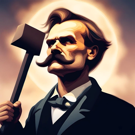 (So stellt sich KI den mit dem Hammer philosophierenden Friedrich Nietzsche vor.)