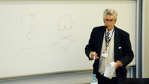 Mario Bunge übernimmt es nun, die Keynote für den Veranstaltungstag zu sprechen. Er nimmt zentral vor dem Auditorium, nahe des zentralen Whiteboard Platz, um im Anschluss während seiner Rede wichtige Konzepte auf der Tafel zu skizzieren.